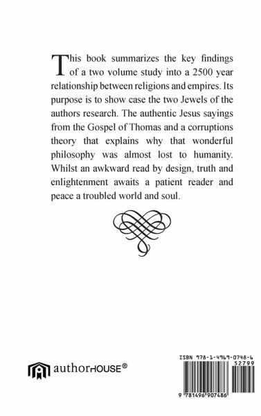 This book is a summary of the first Book. Its purpose is to show case the two Jewels of the authors research. The authentic Jesus sayings from the Gospel of Thomas and teh corruptions theory that explains why that wonderful philosophy was lost to humanity.