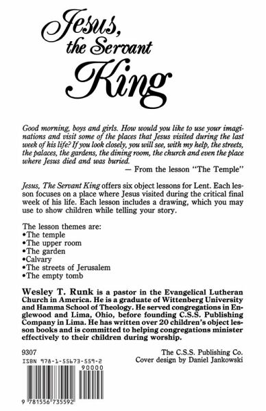 Good morning boys and girls. How would you like to use your imaginations and visit some of the places that Jesus visited during the last week of his life? If you look closely, you will see, with my help, the streets, the palaces, the gardens, the dining room, the church and even the place where Jesus died and was buried. -- from the lesson "The Temple" Jesus, The Servant King offers six object lessons for Lent. Each lesson focuses on a place where Jesus visited during the critical final week of his life. Each lesson includes a drawing, which you may use to show children while telling your story. The lesson themes are: • The temple • The upper room • The garden • Calvary • The streets of Jerusalem • The empty tomb Wesley T. Runk is a pastor in the Evangelical Lutheran Church in America. He is a graduate of Wittenberg University and Hamma School of Theology. He served congregations in Englewood and Lima, Ohio, before founding CSS Publishing Company in Lima. He has written over 20 children's object lesson books and is committed to helping congregations minister effectively to their children during worship.
