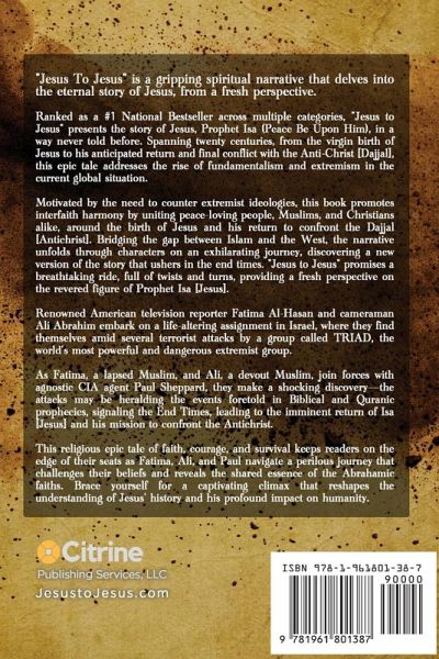 "Jesus To Jesus" is a gripping spiritual narrative that delves into the eternal story of Jesus, from a fresh perspective. Ranked as a #1 National Bestseller across multiple categories, "Jesus to Jesus" presents the story of Jesus, Prophet Isa (Peace Be Upon Him), in a way never told before. Spanning twenty centuries, from the virgin birth of Jesus to his anticipated return and final conflict with the Anti-Christ [Dajjal], this epic tale addresses the rise of fundamentalism and extremism in the current global situation. Motivated by the need to counter extremist ideologies, this book promotes interfaith harmony by uniting peace-loving people, Muslims, and Christians alike, around the birth of Jesus and his return to confront the Dajjal [Antichrist]. Bridging the gap between Islam and the West, the narrative unfolds through characters on an exhilarating journey, discovering a new version of the story that ushers in the end times. "Jesus to Jesus" promises a breathtaking ride, full of twists and turns, providing a fresh perspective on the revered figure of Prophet Isa [Jesus]. Renowned American television reporter Fatima Al-Hasan and cameraman Ali Abrahim embark on a life-altering assignment in Israel, where they find themselves amid several terrorist attacks by a group called TRIAD, the world's most powerful and dangerous extremist group. As Fatima, a lapsed Muslim, and Ali, a devout Muslim, join forces with agnostic CIA agent Paul Sheppard, they make a shocking discovery-the attacks may be heralding the events foretold in Biblical and Quranic prophecies, signaling the End Times, leading to the imminent return of Isa [Jesus] and his mission to confront the Antichrist. This religious epic tale of faith, courage, and survival keeps readers on the edge of their seats as Fatima, Ali, and Paul navigate a perilous journey that challenges their beliefs and reveals the shared essence of the Abrahamic faiths. Brace yourself for a captivating climax that reshapes the understanding of Jesus' history and his profound impact on humanity.