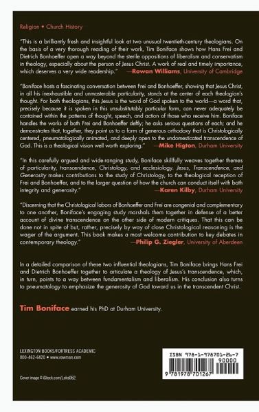 Contemporary scholars aiming to articulate a 'middle way' between fundamentalism and liberalism regularly draw upon Hans Frei and Dietrich Bonhoeffer, yet they are rarely brought together on this question, if at all. Here, Tim Boniface highlights the promise of reading them together, proposing especially that a discussion of Jesus' transcendence derived from their responses to modernity is an effective locus for considering their combined contribution to a 'middle way' discussion. Having outlined a rationale for a theology of Christological transcendence, this work describes in detail how both Frei and Bonhoeffer point towards a nuanced approach to the transcendence of Jesus-especially in terms of the importance of articulating that transcendence at the level of the 'unsubstitutable historical particularity' of Christ in the cultural-linguistic setting of the Christian community (Frei) and the impact of a theologia crucis and a participatory cosmic Christology on such thinking (Bonhoeffer). Offering a unique summary of the key ways in which the two theologians' works mutually critique and strengthen one another, Boniface then articulates a pneumatological emphasis lacking in both Frei and Bonhoeffer, stressing the supreme generosity of God at the heart of what it means to say that Jesus transcends.