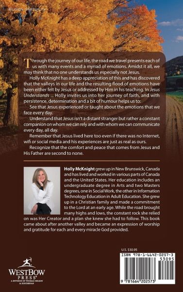 Through the journey of our life, the road we travel presents each of us with many events and a myriad of emotions. Amidst it all, we may think that no one understands us especially not Jesus. Holly McKnight has a deep appreciation of this and has discovered that the valleys in our life and the resulting flood of emotions have been either felt by Jesus or addressed by Him in his teaching. In Jesus Understands ... Holly invites us into her journey of faith, and with persistence, determination and a bit of humour helps us to: See that Jesus experienced or taught about the emotions that we face every day. Understand that Jesus isn't a distant stranger but rather a constant companion on whom we can rely and with whom we can communicate every day, all day. Remember that Jesus lived here too even if there was no Internet, wifi or social media and his experiences are just as real as ours. Recognize that the comfort and peace that comes from Jesus and His Father are second to none.