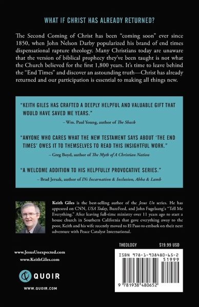 What if Christ has already returned? The Second Coming of Christ has been "coming soon" ever since 1850, when John Nelson Darby popularized his brand of end times dispensational rapture theology. Many Christians today are unaware that the version of biblical prophecy they've been taught is not what the Church believed for the first 1,800 years. It's time to leave behind the "End Times" and discover an astounding truth-Christ has already returned and our participation is essential to making all things new.