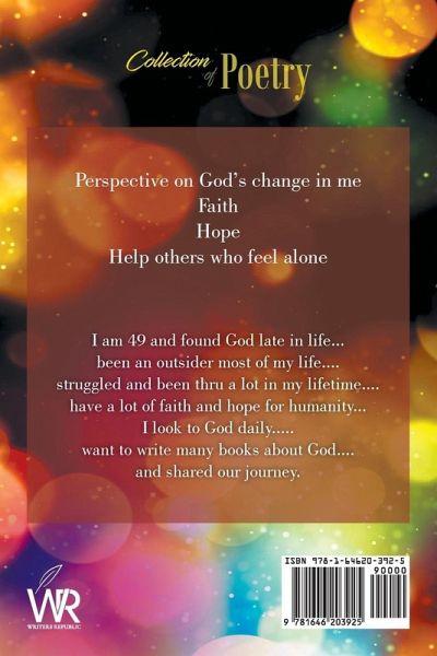 I am 49 and found God late in life... been an outsider most of my life.... struggled and been thru a lot in my lifetime.... have a lot of faith and hope for humanity... I look to God daily..... want to write many books about God.... and shared our journey.