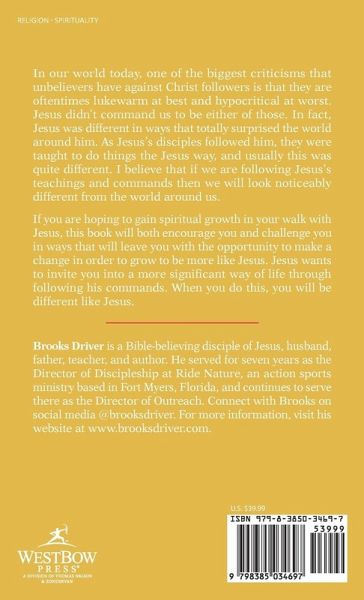 In our world today, one of the biggest criticisms that unbelievers have against Christ followers is that they are oftentimes lukewarm at best and hypocritical at worst. Jesus didn't command us to be either of those. In fact, Jesus was different in ways that totally surprised the world around him. As Jesus's disciples followed him, they were taught to do things the Jesus way, and usually this was quite different. I believe that if we are following Jesus's teachings and commands then we will look noticeably different from the world around us. If you are hoping to gain spiritual growth in your walk with Jesus, this book will both encourage you and challenge you in ways that will leave you with the opportunity to make a change in order to grow to be more like Jesus. Jesus wants to invite you into a more significant way of life through following his commands. When you do this, you will be different like Jesus.