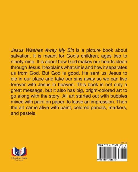 Jesus Washes Away My Sin is a picture book about salvation. It is meant for God's children, ages two to ninety-nine. It is about how God makes our hearts clean through Jesus. It explains what sin is and how it separates us from God. But God is good. He sent us Jesus to die in our place and take our sins away so we can live forever with Jesus in heaven. This book is not only a great message, but it also has big, bright-colored art to go along with the story. All art started out with bubbles mixed with paint on paper, to leave an impression. Then the art came alive with paint, colored pencils, markers, and pastels.