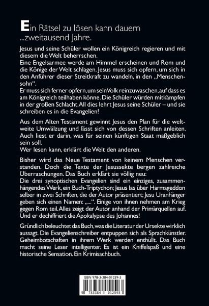 Galiläa vor 2000 Jahren: Jesus will Herrscher eines Großkönigtums werden, es soll das Imperium Romanum ablösen. Auf alle Ewigkeit soll es die Welt beherrschen. Dafür müsse ein Krieg geführt werden. Unter anderem gegen Rom und seine Konföderierten. Gegenüber seiner Religion ist Jesus konservativ und rechtgläubig eingestellt. Er ist Bibelfundamentalist. Das Buch enthüllt den wahren Inhalt der Evangelien und weiter Teile des Neuen Testamentes. Es stellt deren richtige Lesart vor. Jesu Kriegspläne treten deutlich hervor, da der Autor Jesussätze richtig übersetzt sowie Begriffe und sprachliche Wendungen auf ihre Herkunft (Texttradition) zurückverfolgt und daran ihre Bedeutung enthüllt. Schließlich wird interessant, wie es zu einem Meinungsstreit um Jesu Lehre kam. Die Evangelien sind im Abwehrkampf gegen die Spalter geschrieben. Gegen die Christen. Doch heute werden sie vollkommen missverstanden.Schon dass Jesus seine Botschaft an alle Welt gleichrangig adressierte, ist ein Missverständnis. Bis ins kleinste Detail wird gezeigt, woher er seine Lehre nimmt und wie er sich ihre Erfüllung vorstellt. Das alles leitet der Autor präzise her.Auf den Leser warten unzählige Überraschungen, da die Evangelien nun richtig übersetzt und verstanden werden. Und weil ihre Autoren mit dem Eingreifen Gottes rechnen. Jesus zeigt sich dann und wann als Sprachkünstler, der mit cleveren Andeutungen operiert. Auch stehen die Evangelien "Matthäus" und "Lukas" in einem speziellen Verhältnis zueinander: Eins ist jeweils als die Schablone des anderen zu lesen. Anhand eines Werkes von Josephus wird schließlich gezeigt, dass die Ursekte sich am Krieg 66/70 beteiligt.Alle relevanten Texte werden ausgeschüttelt und solide untersucht. Auf vielfältige Weise enthüllt das Buch intellektuelle beziehungsweise kognitive Täuschungen beim Lesen der Evangelien. Desweiteren öffnen Tiefenbohrungen ins Alte Testament (auch dort gibt es Fehlübersetzungen) die Augen für die Frage, was wirklich im Evangelium steht. Doch die große Überraschung wartet im Text und sei hier nicht verraten ...