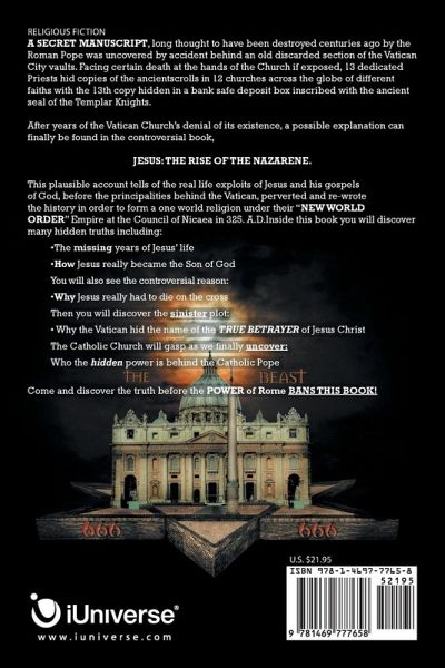 A secret manuscript, long thought to have been destroyed centuries ago by the Roman Pope was uncovered by accident behind an old discarded section of the Vatican City vaults. Facing certain death at the hands of the Church if exposed, 13 dedicated Priests hid copies of the ancient scrolls in 12 churches across the globe of different faiths with the 13th copy hidden in a bank safe deposit box inscribed with the ancient seal of the Templar Knights. After years of the Vatican Church's denial of its existence, a possible explanation can finally be found in the controversial book, Jesus: The Rise of the Nazarene. This plausible account tells of the real life exploits of Jesus and his gospels of God, before the principalities behind the Vatican, perverted and re-wrote the history in order to form a one world religion under their "NEW WORLD ORDER" Empire at the Council of Nicaea in 325. A.D.Inside this book you will discover many hidden truths including: ¿The missing years of Jesus' life ¿How Jesus really became the Son of God You will also see the controversial reason: ¿Why Jesus really had to die on the cross Then you will discover the sinister plot: ¿ Why the Vatican hid the name of the true betrayer of Jesus Christ The Catholic Church will gasp as we finally uncover: Who the hidden power is behind the Catholic Pope Come and discover the truth before the power of Rome bans this book!