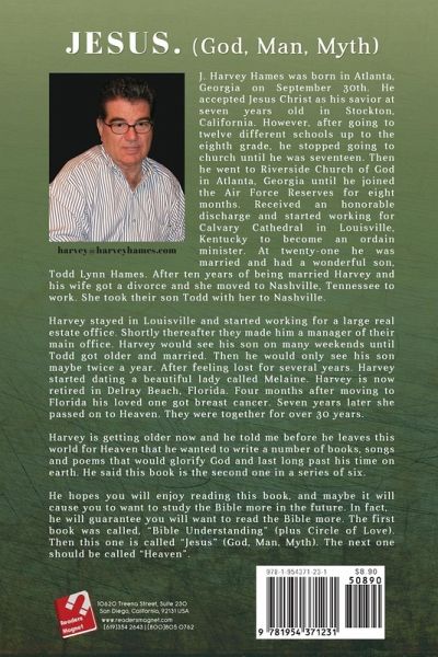 J. Harvey Hames was born in Atlanta, Georgia on September 30th. He accepted Jesus Christ as his savior at seven years old in Stockton, California. However, after going to twelve different schools up to the eighth grade, he stopped going to church until he was seventeen. Then he went to Riverside Church of God in Atlanta, Georgia until he joined the Air Force Reserves for eight months. Received an honorable discharge and started working for Calvary Cathedral in Louisville, Kentucky to become an ordain minister. At twenty-one he was married and had a wonderful son, Todd Lynn Hames. After ten years of being married Harvey and his wife got a divorce and she moved to Nashville, Tennessee to work. She took their son Todd with her to Nashville. Harvey stayed in Louisville and started working for a large real estate office. Shortly thereafter they made him a manager of their main office. Harvey would see his son on many weekends until Todd got older and married. Then he would only see his son maybe twice a year. After feeling lost for several years. Harvey started dating a beautiful lady called Melaine. Harvey is now retired in Delray Beach, Florida. Four months after moving to Florida his loved one got breast cancer. Seven years later she passed on to Heaven. They were together for over 30 years. Harvey is getting older now and he told me before he leaves this world for Heaven that he wanted to write a number of books, songs and poems that would glorify God and last long past his time on earth. He said this book is the second one in a series of six. He hopes you will enjoy reading this book, and maybe it will cause you to want to study the Bible more in the future. In fact, he will guarantee you will want to read the Bible more. The first book was called, "Bible Understanding" (plus Circle of Love). Then this one is called "Jesus" (God, Man, Myth). The next one should be called "Heaven".