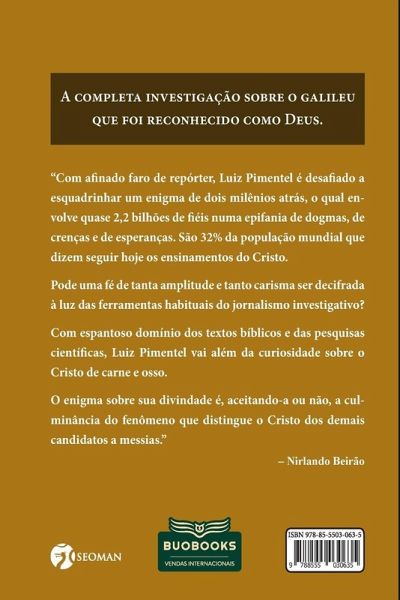 Quem foi Jesus? Esse é um enigma que há dois milênios muitos vêm tentando entender, seja através da religião ou da ciência. Luiz Pimentel resolveu lançar um novo olhar para essa pergunta: uma fé que move 32% da população mundial pode ser decifrada à luz das ferramentas habituais do jornalismo investigativo? Com espantoso domínio dos textos bíblicos e das pesquisas científicas, o jornalista vai além da curiosidade sobre o Jesus de carne e osso e busca entender toda a história: quem escreveu os evangelhos, quando, quais foram as motivações para esses serem os livros que entraram na Bíblia, quais foram os textos proibidos pela Igreja...O enigma sobre a divindade de Cristo é, aceitando-a ou não, o que o distingue dos demais candidatos a messias, mas, aqui, Pimentel nos leva pelo caminho de como um galileu foi reconhecido como Deus.