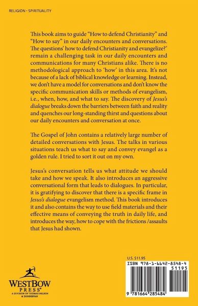 This book aims to guide "How to defend Christianity" and "How to say" in our daily encounters and conversations. The questions' how to defend Christianity and evangelize?' remain a challenging task in our daily encounters and communications for many Christians alike. There is no methodological approach to 'how' in this area. It's not because of a lack of biblical knowledge or learning. Instead, we don't have a model for conversations and don't know the specific communication skills or methods of evangelism, i.e., when, how, and what to say. The discovery of Jesus's dialogue breaks down the barriers between faith and reality and quenches our long-standing thirst and questions about our daily encounters and conversation at once. The Gospel of John contains a relatively large number of detailed conversations with Jesus. The talks in various situations teach us what to say and convey evangel as a golden rule. I tried to sort it out on my own. Jesus's conversation tells us what attitude we should take and how we speak. It also introduces an aggressive conversational form that leads to dialogues. In particular, it is gratifying to discover that there is a specific frame in Jesus's dialogue evangelism method. This book introduces it and also contains the way to use field materials and their effective means of conveying the truth in daily life, and introduces the way, how to cope with the frictions /assaults that Jesus had shown.