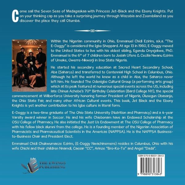 Within the Nigerian community in Ohio, Emmanuel Chidi Ezirim, a.k.a. "The E-Doggy" is considered the Igbo Sheppard. At age 13 in 1980, E-Doggy moved to the United States to live with his oldest sibling, Egondu Onyejekwe, Ph.D. Emmanuel is the 6th of 7 children born to Josiah Ufere & Cecilia Nwanu Ezirim of Umoke, Owerre-Nkworji in Imo State Nigeria. He started his secondary education at Sacred Heart Secondary School, Aba (Saharco), and transferred to Centennial High School in Columbus, Ohio. Although he left the world he knew as a child in Aba, the Saharco never left him. He founded The Odenigbo Cultural Group (a performing arts group) which at its peak featured at numerous special events across the US, including late Chinua Achebe's 70th Birthday Celebration (Bard College NY), the special commencement at Wilberforce University honoring former President of Nigeria, Olusegun Obasanjo, the Ohio State Fair, and many other African Cultural events. This book, Jet Black and the Ebony Knights is yet another contribution to his Igbo culture in literal form. E-Doggy is a two-time graduate of The Ohio State University (Nutrition and Pharmacy) and a 4-year Varsity award winner in Soccer. He and his wife Chiebonam have an Endowed Scholarship at the OSU College of Pharmacy. He also initiated the Just Us Endowment at The OSU College of Pharmacy with his fellow black alumni from the college. He is a founding member of the Nigerian Association of Pharmacists and Pharmaceutical Scientists in the Americas (NAPPSA). He is the NAPPSA Business-to-Business Chair and President Elect. Emmanuel Chidi Chukwumaeze Ezirim, (E-Doggy Nwachinemere) resides in Columbus, Ohio with his wife Chichi and their children Nnamdi, Caesar "CC", Arinze "Bro-Ko-To" and Angel "Dada".