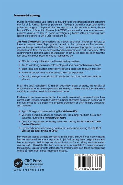 Currently serving as a resource for the National Center for Toxological Research in their work with the Gulf Coast oil spill, this book presents current research conducted primarily by the airforce on the toxic effects of JP-8 jet fuel on the pulmonary, immune, dermal, and nervous systems. It examines the history and chemistry involved with the handling of jet fuel, and discusses the impact of exposure. In all, the book considers 13 toxicology studies of significance, the results of which are currently shaping US armed services policy. It will enable all of the hydrocarbon industry to make better choices regarding fuel handling.