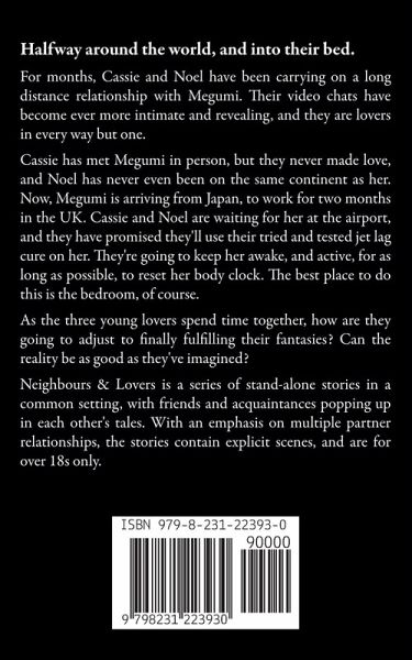 Halfway around the world, and into their bed. For months, Cassie and Noel have been carrying on a long distance relationship with Megumi. Their video chats have become ever more intimate and revealing, and they are lovers in every way but one. Cassie has met Megumi in person, but they never made love, and Noel has never even been on the same continent as her. Now, Megumi is arriving from Japan, to work for two months in the UK. Cassie and Noel are waiting for her at the airport, and they have promised they'll use their tried and tested jet lag cure on her. They're going to keep her awake, and active, for as long as possible, to reset her body clock. The best place to do this is the bedroom, of course. As the three young lovers spend time together, how are they going to adjust to finally fulfilling their fantasies? Can the reality be as good as they've imagined? Neighbours & Lovers is a series of stand-alone stories in a common setting, with friends and acquaintances popping up in each other's tales. With an emphasis on multiple partner relationships, the stories contain explicit scenes, and are for over 18s only.