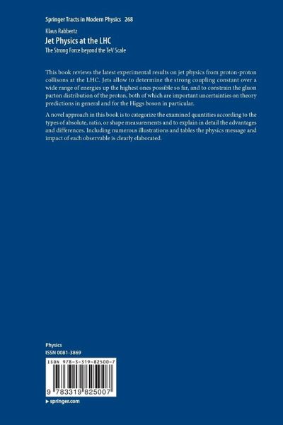 This book reviews the latest experimental results on jet physics from proton-proton collisons at the LHC. Jets allow to determine the strong coupling constant over a wide range of energies up the highest ones possible so far, and to constrain the gluon parton distribution of the proton, both of which are important uncertainties on theory predictions in general and for the Higgs boson in particular.A novel approach in this book is to categorize the examined quantities according to the types of absolute, ratio, or shape measurements and to explain in detail the advantages and differences. Including numerous illustrations and tables the physics message and impact of each observable is clearly elaborated.