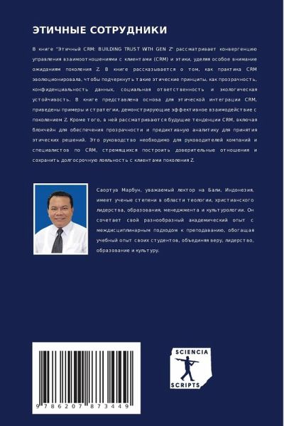 V knige "Jetichnyj CRM: BUILDING TRUST WITH GEN Z" rassmatriwaet konwergenciü uprawleniq wzaimootnosheniqmi s klientami (CRM) i ätiki, udelqq osoboe wnimanie ozhidaniqm pokoleniq Z. V knige rasskazywaetsq o tom, kak praktika CRM äwolücionirowala, chtoby podcherknut' takie äticheskie principy, kak prozrachnost', konfidencial'nost' dannyh, social'naq otwetstwennost' i äkologicheskaq ustojchiwost'. V knige predstawlena osnowa dlq äticheskoj integracii CRM, priwedeny primery i strategii, demonstriruüschie äffektiwnoe wzaimodejstwie s pokoleniem Z. Krome togo, w nej rassmatriwaütsq buduschie tendencii CRM, wklüchaq blokchejn dlq obespecheniq prozrachnosti i prediktiwnuü analitiku dlq prinqtiq äticheskih reshenij. Jeto rukowodstwo neobhodimo dlq rukowoditelej kompanij i specialistow po CRM, stremqschihsq postroit' doweritel'nye otnosheniq i sohranit' dolgosrochnuü loql'nost' s klientami pokoleniq Z.