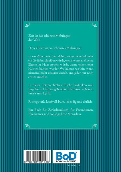 Zeit ist das schönste Mitbringsel der Welt.Dieses Buch ist ein schönstes Mitbringsel.Ja, wo kämen wir denn dahin, wenn niemand mehr ein Gedicht schreiben würde, wenn keiner mehr eine Blume ins Haar stecken würde, wenn keiner mehr Kuchen backen würde? Wo kämen wir hin, wenn niemand mehr aussäen würde, und jeder nur noch ernten möchte.In dieser Lektüre blühen frische Gedanken und Impulse, auf Papier gebrachte Erlebnisse wehen in Poesie und Lyrik.Richtig stark, kraftvoll, bunt, lebendig und ehrlich.Ein Buch für Zwischendurch, für Freundinnen, Ehemänner und sonstige liebe Menschen.Ein Buch für eine Verabredung mit sich selbst.