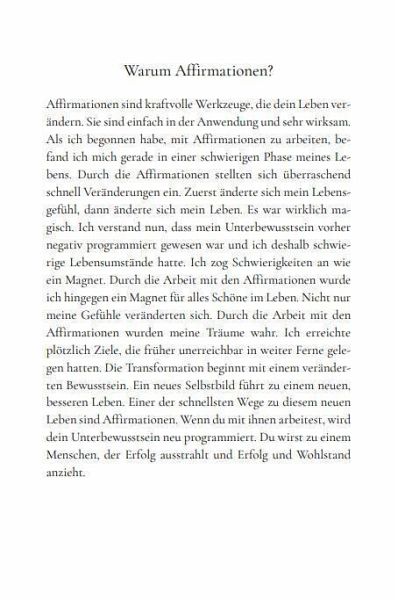 Affirmationen sind eine Quelle der täglichen Inspiration. Durch die Anwendung wird das Tor zu einer Dimension von Wohlstand und innerem Reichtum geöffnet, sodass jeder Tag zu einer Chance wird, das Leben zu verbessern.