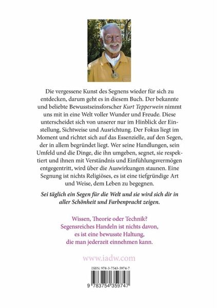Die vergessene Kunst des Segnens wieder für sich zu entdecken, darum geht es in diesem Buch. Der bekannte und beliebte Bewusstseinsforscher Kurt Tepperwein nimmt uns mit in eine Welt voller Wunder und Freude. Diese unterscheidet sich von unserer nur im Hinblick der Einstellung, Sichtweise und Ausrichtung. Der Fokus liegt im Moment und richtet sich auf das Essenzielle, auf den Segen, der in allem begründet liegt. Wer seine Handlungen, sein Umfeld und die Dinge, die ihn umgeben, segnet, sie respektiert und ihnen mit Verständnis und Einfühlungsvermögen entgegentritt, wird über die Auswirkungen staunen. Eine Segnung ist nichts Religiöses, es ist eine tiefgründige Art und Weise, dem Leben zu begegnen. Sei täglich ein Segen für die Welt und sie wird sich dir in aller Schönheit und Farbenpracht zeigen.Wissen, Theorie oder Technik? Segensreiches Handeln ist nichts davon, es ist eine bewusste Haltung, die man jederzeit einnehmen kann.