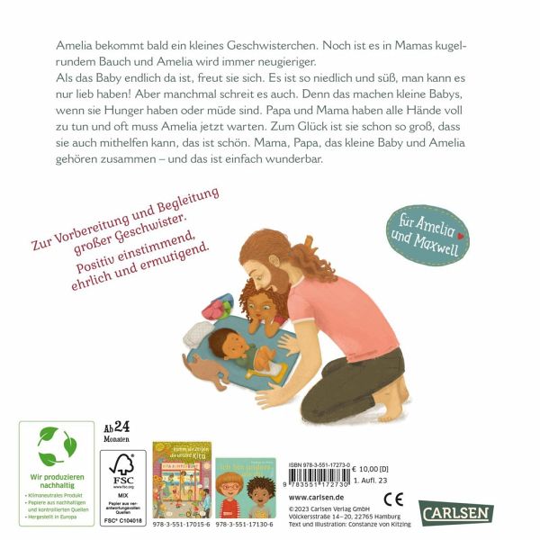 Amelia bekommt bald ein kleines Geschwisterchen. Noch ist es in Mamas kugelrundem Bauch und Amelia wird immer neugieriger. Als das Baby endlich da ist, freut sie sich. Es ist so niedlich und süß, man kann es nur liebhaben! Aber manchmal schreit es auch. Denn das machen kleine Babys, wenn sie Hunger haben oder müde sind. Papa und Mama haben alle Hände voll zu tun und oft muss Amelia jetzt warten. Zum Glück ist Amelia schon so groß, dass sie prima mit ihren Freunden und Freundinnen spielen kann und einfach schon viel mehr kann und darf als ein Baby. Das tut gut. Genauso gut, wie Mama und Papa, wenn sie sagen und zeigen, wie lieb sie Amelia haben.