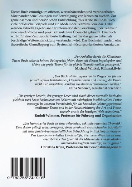 Dieses Buch ermutigt, im resilienten Miteinander neue Lösungen zur Bewältigung von Krisen zu suchen. Wie dies in Arbeitsteams, Familien, Vereinen oder sonstigen Institutionen möglich ist, zeigt ein übersichtliches 7-Phasen-Programm. Zur gemeinsamen und persönlichen Entwicklung trotz Krise stellt das Buch einen theoretischen Rahmen und viele praktische Beispiele dar. Es beschreibt ausführlich, welche positiven Auswirkungen es haben kann, Veränderungen zuzulassen und sich dabei auf die Stärken aller Personen einer Gruppe oder eines Teams zu besinnen. Resilienter Neubeginn wird auf der Grundlage eines evolutionären Denkens angeregt und gewohnte, aber hinderliche Vorstellungen werden kritisch hinterfragt. Die Bedeutungen von Lösungsfokussierung, Akzeptanz, Beziehungspflege, Flexibilität, Transparenz und Wertschätzung sind anschaulich im Kontext von Transformation und Krisenbewältigung erklärt. Es werden aktuelle Ergebnisse der internationalen Resilienzforschung in ein übersichtlichesund praktisch brauchbares Gesamtverständnis gebracht. Mit Krisen sind hier einerseits prekäre Situationen im privaten Bereich sowie bei beruflichen Teams angesprochen. Andererseits geht es auch um globale Krisen, mit denen Teams in Organisationen und Institutionen zurecht kommen müssen. Dabei wird globale Transformation nicht ohne das Zutun starker und gut kooperierender Teams gelingen. Der systemische Ansatz durchzieht den gesamten Inhalt. Das Buch wirbt für eine lösungsorientierte Haltung im Team, bei der das ganze Leben als beständige Weiterentwicklung anerkannt wird. Das Buch stellt insgesamt eine systemisch-lösungsorientierte Grundlegung in Theorie und Praxis dar.