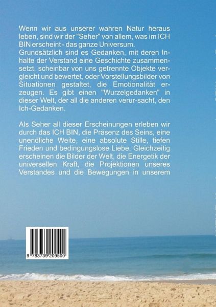 Wenn wir aus unserer wahren Natur heraus leben, sind wir der "Seher" von allem, was im ICH BIN erscheint - das ganze Universum. Grundsätzlich sind es Gedanken, mit deren Inhalte der Verstand eine Geschichte zusammensetzt, scheinbar von uns getrennte Objekte vergleicht und bewertet, oder Vorstellungsbilder von Situationen gestaltet, die Emotionalität erzeugen. Es gibt einen "Wurzelgedanken" in dieser Welt, der all die anderen verursacht, den Ich-Gedanken.Als Seher all dieser Erscheinungen erleben wir durch das ICH BIN, die Präsenz des Seins, eine unendliche Weite, eine absolute Stille, tiefen Frieden und bedingungslose Liebe. Gleichzeitig erscheinen die Bilder der Welt, die Energetik der universellen Kraft, die Projektionen unseres Verstandes und die Bewegungen in unserem Körper; das Herz schlägt, der Atem fließt...Es gibt nichts zu tun, alles geschieht von selbst.