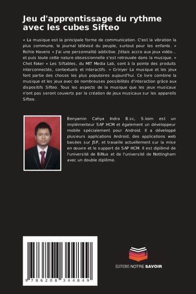 « La musique est la principale forme de communication. C'est la vibration la plus commune, le journal télévisé du peuple, surtout pour les enfants. » Richie Havens « J'ai une personnalité addictive. J'étais accro aux jeux vidéo... et puis toute cette nature obsessionnelle s'est retrouvée dans la musique. » Chet Faker « Les Siftables, du MIT Media Lab, sont à la pointe des produits interconnectés, contextuels et interactifs. » Grinyer La musique et les jeux font partie des choses les plus populaires aujourd'hui. Ce livre combine la musique et les jeux avec de nombreuses possibilités d'interaction grâce aux dispositifs Sifteo. Tous les aspects de la musique que les jeux musicaux n'ont pas seront couverts par la création de jeux musicaux sur les appareils Sifteo.