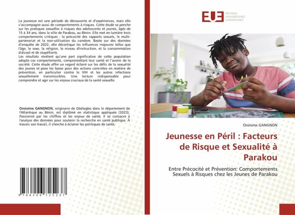 La jeunesse est une période de découverte et d'expériences, mais elle s'accompagne aussi de comportements à risques. Cette étude se penche sur les pratiques sexuelles à risques des adolescents et jeunes, âgés de 15 à 34 ans, dans la ville de Parakou, au Bénin. Elle met en lumière trois comportements critiques : la précocité des rapports sexuels, le multi-partenariat et la non-utilisation du condom. Basée sur des données d'enquête de 2022, elle décortique les influences majeures telles que l'âge, le sexe, la religion, le niveau d'instruction, et la consommation d'alcool et de stupéfiants.Les résultats révèlent qu'une part significative de cette population adopte ces comportements, compromettant leur santé et l'avenir de la société. Cette étude offre un regard éclairé sur les défis de la sexualité des jeunes et pose les bases pour des actions concrètes en matière de prévention, en particulier contre le VIH et les autres infections sexuellement transmissibles. Une lecture indispensable pour comprendre et agir sur les enjeux cruciaux de la santé sexuelle.