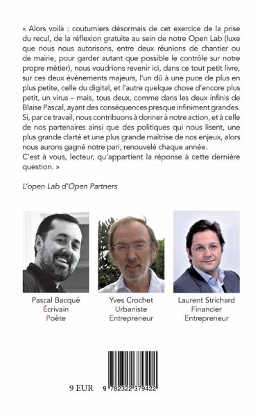 "Alors voilà : coutumiers désormais de cet exercice de la prise du recul, de la réflexion gratuite au sein de notre Open Lab (luxe que nous nous autorisons, entre deux réunions de chantier ou de mairie, pour garder autant que possible le contrôle sur notre propre métier), nous voudrions revenir ici, dans ce tout petit livre, sur ces deux évènements majeurs, l'un dû à une puce de plus en plus petite, celle du digital, et l'autre quelque chose d'encore plus petit, un virus - mais, tous deux, comme dans les deux infinis de Blaise Pascal, ayant des conséquences presque infiniment grandes. Si, par ce travail, nous contribuons à donner à notre action, et à celle de nos partenaires ainsi que des politiques qui nous lisent, une plus grande clarté et une plus grande maîtrise de nos enjeux, alors nous aurons gagné notre pari, renouvelé chaque année.C'est à vous, lecteur, qu'appartient la réponse à cette dernière question."L'open Lab d'Open Partners
