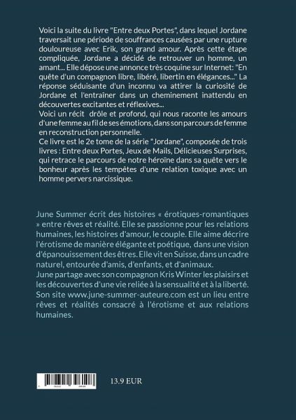 Voici la suite du livre "Entre deux Portes", dans lequel Jordane traversait une période de souffrances causées par une rupture douloureuse avec Erik, son grand amour. Après cette étape compliquée, Jordane a décidé de retrouver un homme, un amant... Elle dépose une annonce très coquine sur Internet: "En quête d'un compagnon libre, libéré, libertin en élégances..." La réponse séduisante d'un inconnu va attirer la curiosité de Jordane et l'entraîner dans un cheminement inattendu en découvertes excitantes et réflexives...Voici un récit drôle et profond, qui nous raconte les amours d'une femme au fil de ses émotions, dans son parcours de femme en reconstruction personnelle.Ce livre est le 2e tome de la série "Jordane", composée de trois livres : Entre deux Portes, Jeux de Mails, Délicieuses Surprises, qui retrace le parcours de notre héroïne dans sa quête vers le bonheur après les tempêtes d'une relation toxique avec un homme pervers narcissique.