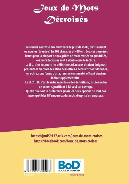 Ce recueil s'adresse aux amateurs de jeux de mots, qu'ils aiment ou non les résoudre ! En 108 charades et 469 entrées, ces dernières issues pour la plupart de nos grilles de mots croisés ou quadrillés, ces mots décroisés sont à double-jeu de lecture.
