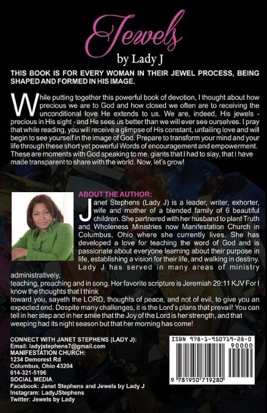 Janet Stephens (Lady J) is a leader, writer, exhorter, wife, and mother of a blended family of 6 beautiful children. She partnered with her husband to plant Truth and Wholeness Ministries now Manifestation Church in Columbus, Ohio, where she currently lives. She has developed a love for teaching the word of God and is passionate about everyone learning about their purpose in life, establishing a vision for their life, and walking in destiny. Lady J has served in many areas of ministry administratively, teaching, preaching, and in song. Her favorite scripture is Jeremiah 29:11 KJV, "For I know the thoughts that I think toward you, sayeth the LORD, thoughts of peace, and not of evil, to give you an expected end." Despite many challenges, it is the Lord's plans that prevail! You can tell in her step and her smile that the Joy of the Lord is her strength and that weeping had its night season. But her morning has come!