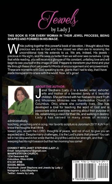 "Jewels: A Book of Daily Devotion and Reflection" by Janet Stephens is an inspiring compilation of daily reflections designed to uplift, encourage, and empower readers on their spiritual journey. Each day presents a unique devotion that focuses on various aspects of Christian living, providing insights and wisdom drawn from the Bible. With a heartfelt dedication to God, Stephens shares powerful nuggets of truth that have brought her personal victory and growth. The book is structured to guide readers through daily meditations that challenge, inspire, and strengthen their faith. From themes of overcoming the past, embracing love on another level, to finding freedom in Christ, each devotion offers practical advice and spiritual encouragement. Stephens' transparent sharing of her own experiences and the challenges she has faced adds a deeply personal touch to the book, making it relatable and impactful for readers. "Jewels" is more than just a devotional; it is a companion for anyone seeking to deepen their relationship with God and walk in the fullness of their divine purpose. The reflections are accompanied by thought-provoking questions and spaces for personal notes, allowing readers to engage actively with the content and apply it to their lives. Whether you are new to faith or looking to rekindle your spiritual fire, this book is a valuable resource for daily inspiration and growth.