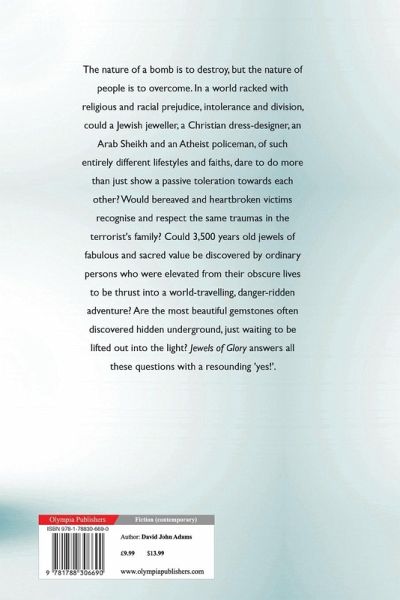 The nature of a bomb is to destroy, but the nature of people is to overcome. In a world racked with religious and racial prejudice, intolerance and division, could a Jewish jeweller, a Christian dress-designer, an Arab Sheikh and an Atheist policeman, of such entirely different lifestyles and faiths, dare to do more than just show a passive toleration towards each other? Would bereaved and heartbroken victims recognise and respect the same traumas in the terrorist's family? Could 3,500 years old jewels of fabulous and sacred value be discovered by ordinary persons who were elevated from their obscure lives to be thrust into a world-travelling, danger-ridden adventure? Are the most beautiful gemstones often discovered hidden underground, just waiting to be lifted out into the light? Jewels of Glory answers all these questions with a resounding 'yes!'.