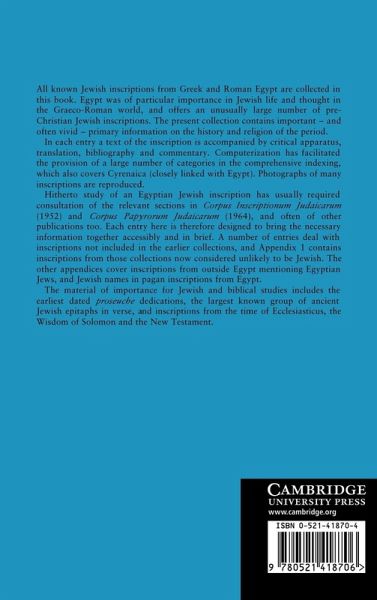 This book collects all known Jewish inscriptions in Egypt between the third century BC and the sixth century AD. The entry on each inscription provides text, translation, bibliography and commentary. Hitherto, it has been necessary to refer to an older collection (1952, but essentially pre-war) together with a separately-published revision (1964), with very limited indexing. Here the aim has been to include inscriptions not in the earlier collection, to bring together the necessary information on each inscription, and to supply full indexing. The inscriptions form a vivid primary source for Jewish history and religion.