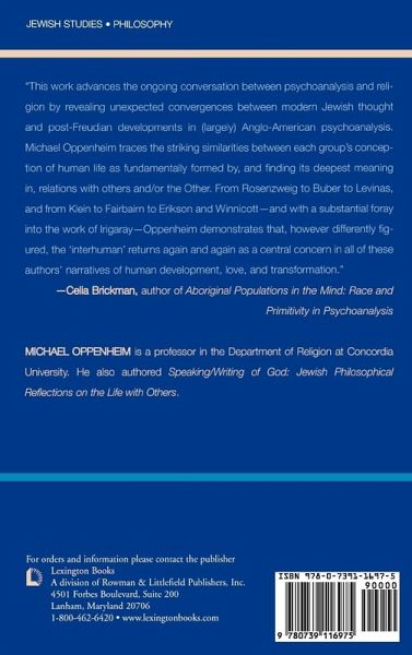 This work advances the ongoing conversation between psychoanalysis and religion by revealing unexpected convergences between modern Jewish thought and post-Freudian developments in (largely) Anglo-American psychoanalysis. Oppenheim traces the striking similarities between each group's conception of human life as fundamentally formed by, and finding its deepest meaning in, relations with others and/or the Other. From Rosenzweig to Buber to Levinas, and from Melanie Klein to Fairbairn to Erikson and Winnicott-and with a substantial foray into the work of Luce Irigaray-Oppenheim demonstrates that, however differently figured, the 'interhuman' returns again and again as a central concern in all of these authors' narratives of human development, love and transformation. -- Celia Brickman, author of Aboriginal Populations in the Mind: Race and Primitivity in Psychoanalysis