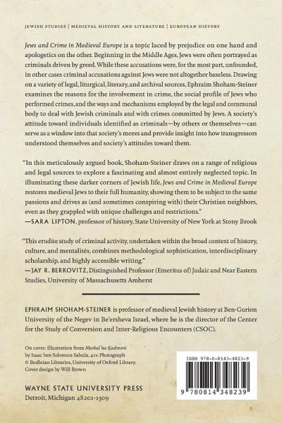 Jews and Crime in Medieval Europe is a topic laced by prejudice on one hand and apologetics on the other. Beginning in the Middle Ages, Jews were often portrayed as criminals driven by greed. While these accusations were, for the most part, unfounded, in other cases criminal accusations against Jews were not altogether baseless. Drawing on a variety of legal, liturgical, literary, and archival sources, Ephraim Shoham-Steiner examines the reasons for the involvement in crime, the social profile of Jews who performed crimes, and the ways and mechanisms employed by the legal and communal body to deal with Jewish criminals and with crimes committed by Jews. A society's attitude toward individuals identified as criminals-by others or themselves-can serve as a window into that society's mores and provide insight into how transgressors understood themselves and society's attitudes toward them. The book is divided into three main sections. In the first section, Shoham-Steiner examines theft and crimes of a financial nature. In the second section, he discusses physical violence and murder, most importantly among Jews but also incidents when Jews attacked others and cases in which Jews asked non-Jews to commit violence against fellow Jews. In the third section, Shoham-Steiner approaches the role of women in crime and explores the gender differences, surveying the nature of the crimes involving women both as perpetrators and as victims, as well as the reaction to their involvement in criminal activities among medieval European Jews. While the study of crime and social attitudes toward criminals is firmly established in the social sciences, the history of crime and of social attitudes toward crime and criminals is relatively new, especially in the field of medieval studies and all the more so in medieval Jewish studies. Jews and Crime in Medieval Europe blazes a new path for unearthing daily life history from extremely recalcitrant sources. The intended readership goes beyond scholars and students of medieval Jewish studies, medieval European history, and crime in pre-modern society.