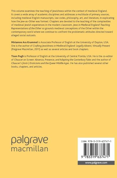 1 Introduction: Jews in Medieval England: A Temporal and Pedagogical Vision.- 2 Addressing the Jew, as Other, in Anglo-Saxon England.- 3 Englishness/Jewishness/Otherness: English National Identity.- 4 The Historical Jew in the Modern Classroom: Problematizing the Creation of Jewish Identity in Medieval England.- 5 Creating Jewish Otherness: The Jew as an Archetype in Fourteenth-Century Philosophical and Theological Reasoning.- 6 Jews as Others and Neighbors: Encountering Chaucer's Prioress in the Classroom.- 7 Reading the Other: Teaching Chaucer's Prioress's Tale in Its Late Medieval Context.- 8 The Chosen and the Chastised: Naming Jews in the York Mystery Plays.- 9 Performing Jewishness in the CroxtonPlay of the Sacrament.- 10 The Norwich Blood Libel Mounted Once Again: A Pedagogy for Tolerance in Arnold Wesker's Blood Libel (1991).- 11 Illuminating Difference: Christian Images of Jews in Medieval English Manuscripts.- 12 Visualizing the Jewish Other inChaucer's Prioress's Tale.- 13 "You Had to Have Been There": The Importance of Place in Teaching Jewish History and Literature.- 14 Thomas of Monmouth's The Life and Passion of William of Norwich: Mapping Commemorative Violence.- 15 Why Not Read Petrus Alfonsi's Disciplina clericalis in the British Literature Survey?.- 16 Bringing Meir b. Elijah of Norwich into the Classroom: Discovering a Medieval Minority Poet.- 17 Teaching Jewish and Christian Daily Interaction in Medieval England.- 18 "Love Thy Neighbor, Love Thy Fellow": Teaching Gower's Representation of the Unethical Jew.- 19 Difficult Sameness and Weird Time: Starting with The Siege of Jerusalem.