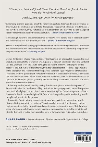 "Jews on the Frontier offers a religious history that begins in an unexpected place: on the road. Shari Rabin recounts the journey of Jewish people as they left Eastern cities and ventured into the American West and South during the nineteenth century. It brings to life the successes and obstacles of these travels, from the unprecedented economic opportunities to the anonymity and loneliness that complicated the many legal obligations of traditional Jewish life. Without government-supported communities or reliable authorities, where could one procure kosher meat? Alone in the American wilderness, how could one find nine co-religionists for a minyan (prayer quorum)? Without identity documents, how could one really know that someone was Jewish? Rabin argues that Jewish mobility during this time was pivotal to the development of American Judaism. In the absence of key institutions like synagogues or charitable organizations which had played such a pivotal role in assimilating East Coast immigrants, ordinary Jews on the frontier created religious life from scratch, expanding and transforming Jewish thought and practice in the process. Jews on the Frontier vividly recounts the story of a neglected era in American Jewish history, offering a new interpretation of American religions, rooted not in congregations or denominations, but in the politics and experiences of being on the move. This book shows that by focusing on everyday people, we gain a more complete view of how American religion has taken shape."--