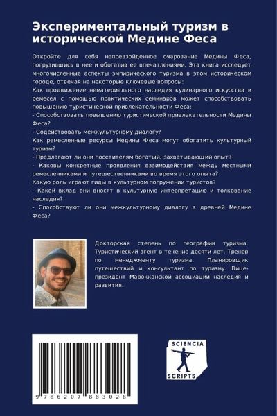 Otkrojte dlq sebq neprewzojdennoe ocharowanie Mediny Fesa, pogruziwshis' w nee i obogatiw ee wpechatleniqmi. Jeta kniga issleduet mnogochislennye aspekty ämpiricheskogo turizma w ätom istoricheskom gorode, otwechaq na nekotorye klüchewye woprosy:Kak prodwizhenie nematerial'nogo naslediq kulinarnogo iskusstwa i remesel s pomosch'ü prakticheskih seminarow mozhet sposobstwowat' powysheniü turisticheskoj priwlekatel'nosti Fesa:- Sposobstwowat' powysheniü turisticheskoj priwlekatel'nosti Mediny Fesa?- Sodejstwowat' mezhkul'turnomu dialogu?Kak remeslennye resursy Mediny Fesa mogut obogatit' kul'turnyj turizm?- Predlagaüt li oni posetitelqm bogatyj, zahwatywaüschij opyt?- Kakowy konkretnye proqwleniq wzaimodejstwiq mezhdu mestnymi remeslennikami i puteshestwennikami wo wremq ätogo opyta?Kakuü rol' igraüt gidy w kul'turnom pogruzhenii turistow?- Kakoj wklad oni wnosqt w kul'turnuü interpretaciü i tolkowanie naslediq?- Sposobstwuüt li oni mezhkul'turnomu dialogu w drewnej Medine Fesa?