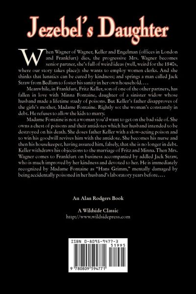 And she thinks that lunatics can be cured by kindness; and springs a man called Jack Straw from Bedlam to foster his sanity in her own household. . . . Meanwhile, in Frankfurt, Fritz Keller, son of one of the other partners, has fallen in love with Minna Fontaine, daughter of a sinister widow whose husband made a lifetime study of poisons. But Keller's father disapproves of the girls's mother, Madame Fontaine. Rightly so: the woman's constantly in debt. He refuses to alllow the kids to marry. Madame Fontaine is not a woman you'd want to get on the bad side of. She owns a chest of poisons and their antidotes which her husband intended to be destroyed on his death. She doses father Keller with a slow-acting poison and to win his goodwill revives him with the antidote. She becomes his nurse and then his housekeeper, having assured him, falsely, that she is no longer in debt. Keller withdraws his objections to the marriage of Fritz and Minna. Then Mrs. Wagner comes to Frankfurt on business accompanied by addled Jack Straw, who is much improved by her kindness and devoted to her. He is immediately recognized by Madame Fontaine as "Hans Grimm," mentally damaged by being accidentally poisoned in her husband's laboratory years before. . . .