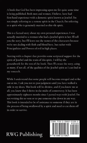 A book that God has been impressing upon me for quite some time is being published. Both men and women, I believe, have had first-hand experience with a demonic spirit known as Jezebel. I'm not simply referring to a remote spirit in the Church; I'm referring to a spirit who is genuinely married to this vile spirit. This is a factual story about my own personal experiences. I was actually married to a woman who had a Jezebel spirit in her. I'll tell you the story, but I'll leave out the names of the characters because we're not dealing with flesh and blood here, but rather with Principalities and Powers of evil in high places. Starting with a chapter that provides some scriptural support for the spirit of Jezebel and the traits of this spirit, I will lay the groundwork for the rest of the book. Then I'll create the story, using as many, if not all, of the qualities of the Jezebel spirit as I can find in my research. While I understand that some people will become enraged and strike out at me, I ask you not to pass judgment until you have walked a mile in my shoes. This book will be divisive, and if you know me at all, you know that I thrive in the midst of controversy. It has been approximately eighteen months since I parted ways with Jezebel. I'm not writing this to vent or to put someone else down in any way. This book is intended to be of assistance to someone if they are in the process of being swallowed by a spirit and need to cut them off in order to survive.