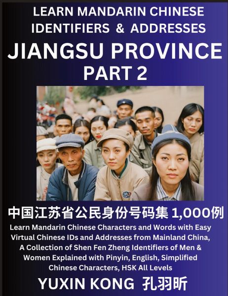 Let's learn Mandarin Chinese while appreciating the Shen Fen Zheng identifiers (¿¿¿¿¿) from different cities and counties of China's Jiangsu Province (¿¿¿). This book contains 100 imaginary (virtual) Chinese Shen Fen Zheng of men and women of different Chinese ethnic groups to help the students of Mandarin Chinese language understand the concept of Chinese IDs along with associated non-real addresses, postal codes, and phone numbers. The book series contain 10 books and total 1,000 Chinese IDs. Pinyin and English have been provided for all the addresses. The titles are suitable for the students of HSK all levels.