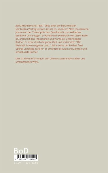Jiddu Krishnamurti (1895-1986), einer der bekanntesten spirituellen Vortragsredner des 20. Jh., wurde im Alter von vierzehn Jahren von der Theosophischen Gesellschaft zum Weltlehrer bestimmt und erzogen. Er wandte sich schließlich von dieser Rolle ab, brach mit den Theosophen und wurde ein unabhängiger Redner. Er reiste durch die ganze Welt und verkündete: "Die Wahrheit ist ein wegloses Land." Seine Lehre der Freiheit fand überall unzählige Zuhörer. Er errichtete Schulen und Zentren und schrieb viele Bücher. Dies ist eine Einführung in sein überaus spannendes Leben und umfangreiches Werk.