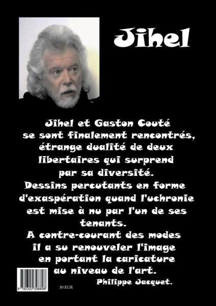 Cet anartiste a beaucoup compté pour moi, il est toujours là présent comme le furent à toutes époques ces femmes ou hommes à la marge, ceux qui ne sont pas dans le moule, il a beaucoup compté oui et moi je n'ai pas compté les dessins que j'ai pu faire en son hommage, 100, 200 ? moins, plus, peu importe, tu étais là à me regarder, à souffler sur mes révoltes, de Mai 68 au Larzac, partout et encore à la veille de l'absence, ce témoignage je te le dois, toi qui m'as donné l'envie de la négation pour affronter d'autres langages, toi qui m'as donné ce démon de la révolte qui tord les tripes, cette envie de transgresser, de créer l'imprévisible, de déconstruire et d'inventer, de rompre et choquer, je suis né de ton insoumission et je l'ai reproduite en retour en écrits et en dessins et c'est pour ne pas oublier que ce livre voit le jour, pour vous mais aussi pourles générations futures, Merci Couté, merci mille fois.JIHEL.