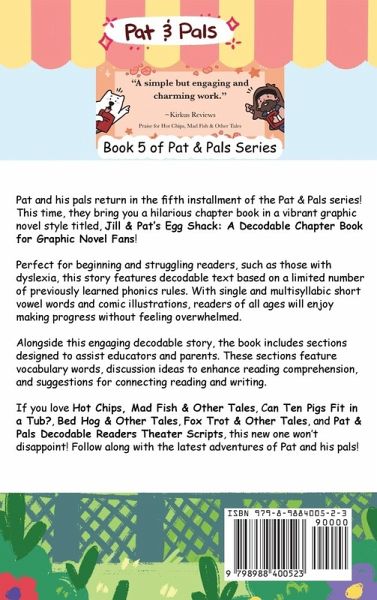 Pat and his pals return in the fifth installment of the Pat & Pals series! This time, they bring you a hilarious chapter book in a vibrant graphic novel style titled, Jill & Pat's Egg Shack: A Decodable Chapter Book for Graphic Novel Fans! Perfect for beginning and struggling readers, such as those with dyslexia, this story features decodable text based on a limited number of previously learned phonics rules. With single and multisyllabic short vowel words and comic illustrations, readers of all ages will enjoy making progress without feeling overwhelmed. Alongside this engaging decodable story, the book includes sections designed to assist educators and parents. These sections feature vocabulary words, discussion ideas to enhance reading comprehension, and suggestions for connecting reading and writing. If you love Hot Chips, Mad Fish & Other Tales, Can Ten Pigs Fit in a Tub?, Bed Hog & Other Tales, Fox Trot & Other Tales, and Pat & Pals Decodable Readers Theater Scripts, this new one won't disappoint! Follow along with the latest adventures of Pat and his pals!