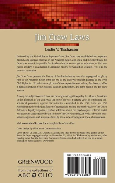 This disquieting yet important book describes the injustices, humiliations, and brutalities inflicted on African Americans in a racist culture that was created-and protected-by the forces of law and order. Jim Crow Laws presents the history of the discriminatory laws that segregated people by race in the American South from the end of the Civil War through passage of the 1965 Civil Rights Act. To paint a true picture of these deplorable restrictions, this book provides a detailed analysis of the creation, defense, justification, and fight against the Jim Crow system. Among the subjects covered here are the origins of legal inequality for African Americans in the aftermath of the Civil War; the role of the U.S. Supreme Court in weakening constitutional protections against discrimination established in the 13th, 14th, and 15th Amendments; the white justification of segregation; and the extreme brutality of Jim Crow's defenders. Equally important, readers will learn about the psychological, political, social, and economic costs endured by the victims of Jim Crow inequality, as well as about the motivations, rejections, and successes faced by those who stood against these abominations.