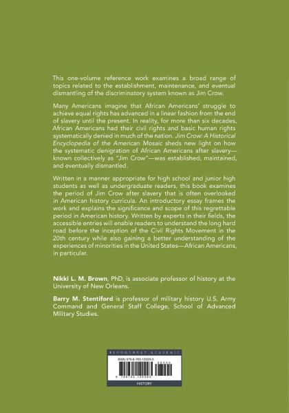 This one-volume reference work examines a broad range of topics related to the establishment, maintenance, and eventual dismantling of the discriminatory system known as Jim Crow. Many Americans imagine that African Americans' struggle to achieve equal rights has advanced in a linear fashion from the end of slavery until the present. In reality, for more than six decades, African Americans had their civil rights and basic human rights systematically denied in much of the nation. Jim Crow: A Historical Encyclopedia of the American Mosaic sheds new light on how the systematic denigration of African Americans after slavery-known collectively as "Jim Crow"-was established, maintained, and eventually dismantled. Written in a manner appropriate for high school and junior high students as well as undergraduate readers, this book examines the period of Jim Crow after slavery that is often overlooked in American history curricula. An introductory essay frames the work and explains the significance and scope of this regrettable period in American history. Written by experts in their fields, the accessible entries will enable readers to understand the long hard road before the inception of the Civil Rights Movement in the 20th century while also gaining a better understanding of the experiences of minorities in the United States-African Americans, in particular.