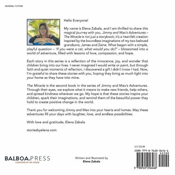 Hello Everyone! My name is Elena Zabala, and I am thrilled to share this magical journey with you. Jimmy and Max's Adventures - The Miracle is not just a storybook; it's a heartfelt creation inspired by the boundless imaginations of my two beloved grandsons, James and Zaine. What began with a simple, playful question - 'If you were a cat, what would you do?' - blossomed into a world of adventure, fi lled with lessons of love, compassion, and hope. Each story in this series is a refl ection of the innocence, joy, and wonder that children bring into our lives. I never imagined I would write or paint, but through faith and quiet moments of refl ection, I discovered a gift I didn't know I had. Now, I'm grateful to share these stories with you, hoping they bring as much light into your home as they have into mine.
