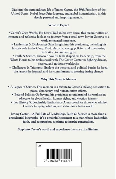 Dive into the extraordinary life of Jimmy Carter, the 39th President of the United States, Nobel Peace Prize laureate, and global humanitarian, in this deeply personal and inspiring memoir. What to Expect: ¿ Carter's Own Words, His Story: Told in his own voice, this memoir offers an intimate and reflective look at his journey from a small-town boy in Georgia to a world-renowned statesman. ¿ Leadership & Diplomacy: Gain insight into his presidency, including his historic role in the Camp David Accords, energy policies, and unwavering dedication to human rights. ¿ Faith & Service: Discover how his faith shaped his leadership, from the White House to his tireless work with The Carter Center in fighting disease, poverty, and injustice worldwide. ¿ Challenges & Triumphs: Explore the personal and political battles he faced, the lessons he learned, and his commitment to creating lasting change. Why This Memoir Matters: ¿ A Legacy of Service: This memoir is a tribute to Carter's lifelong dedication to peace, democracy, and humanitarian efforts. ¿ Beyond Politics: Go beyond his presidency to understand his work as an advocate for global health, human rights, and election fairness. ¿ For History & Leadership Enthusiasts: A must-read for those who admire Carter's integrity, wisdom, and vision for a better world. Jimmy Carter - A Full Life of Leadership, Faith & Service is more than a presidential biography-it's a powerful testament to a man whose leadership, faith, and compassion continue to inspire generations. Step into Carter's world and experience the story of a lifetime.