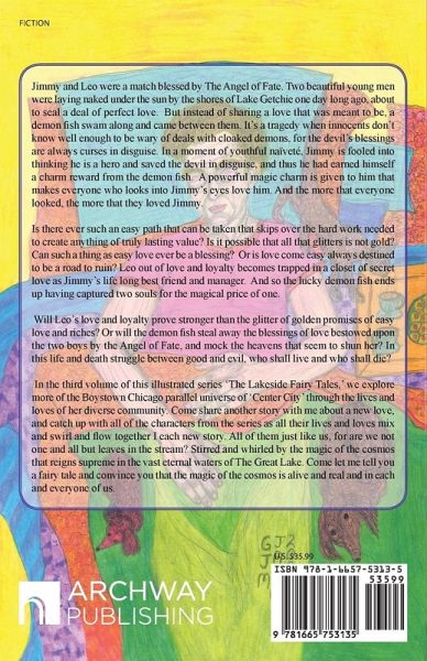 Jimmy and Leo were a match blessed by The Angel of Fate. Two beautiful young men were laying naked under the sun by the shores of Lake Getchie one day long ago, about to seal a deal of perfect love. But instead of sharing a love that was meant to be, a demon fish swam along and came between them. It's a tragedy when innocents don't know well enough to be wary of deals with cloaked demons, for the devil's blessings are always curses in disguise. In a moment of youthful naïveté, Jimmy is fooled into thinking he is a hero and saved the devil in disguise, and thus he had earned himself a charm reward from the demon fish. A powerful magic charm is given to him that makes everyone who looks into Jimmy's eyes love him. And the more that everyone looked, the more that they loved Jimmy. Is there ever such an easy path that can be taken that skips over the hard work needed to create anything of truly lasting value? Is it possible that all that glitters is not gold? Can such a thing as easy love ever be a blessing? Or is love come easy always destined to be a road to ruin? Leo out of love and loyalty becomes trapped in a closet of secret love as Jimmy's life long best friend and manager. And so the lucky demon fish ends up having captured two souls for the magical price of one. Will Leo's love and loyalty prove stronger than the glitter of golden promises of easy love and riches? Or will the demon fish steal away the blessings of love bestowed upon the two boys by the Angel of Fate, and mock the heavens that seem to shun her? In this life and death struggle between good and evil, who shall live and who shall die? In the third volume of this illustrated series 'The Lakeside Fairy Tales,' we explore more of the Boystown Chicago parallel universe of 'Center City' through the lives and loves of her diverse community. Come share another story with me about a new love, and catch up with all of the characters from the series as all their lives and loves mix and swirl and flow together I each new story. All of them just like us, for are we not one and all but leaves in the stream? Stirred and whirled by the magic of the cosmos that reigns supreme in the vast eternal waters of The Great Lake. Come let me tell you a fairy tale and convince you that the magic of the cosmos is alive and real and in each and everyone of us.